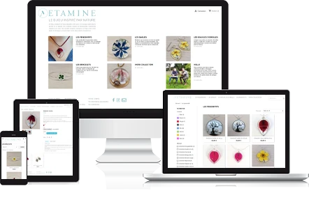 Une boutique en ligne fraîche et lumineuse à l'image des créations ETAMINE, des bijoux composés de fleurs naturelles et de verre.